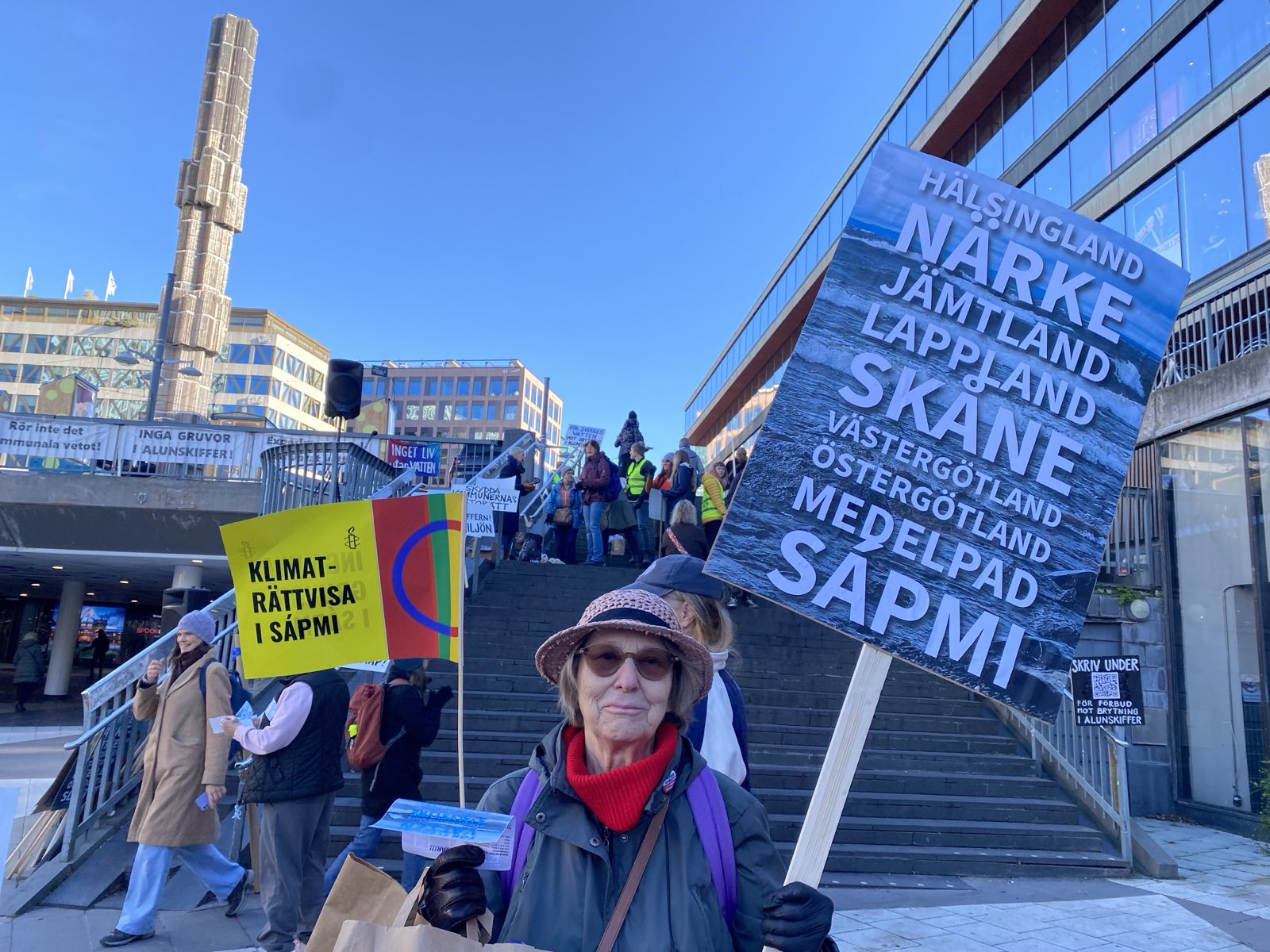 ”Nej till gruva, bryt inte alunskiffer, rädda Storsjön”, står på ett av alla plakat som demonstranterna höll upp på Sergels torg under lördagsförmiddagen.