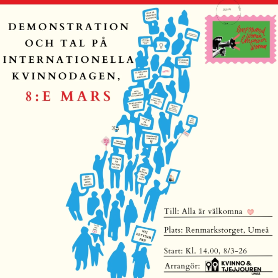 • Kvinnojouren Umeå arrangerar en demonstration Samling kl. 14:00 på Renmarkstorget Tåget avgår 14:15 Avslutning med tal på Renmarkstorget cirka 14:45 → Läs mer