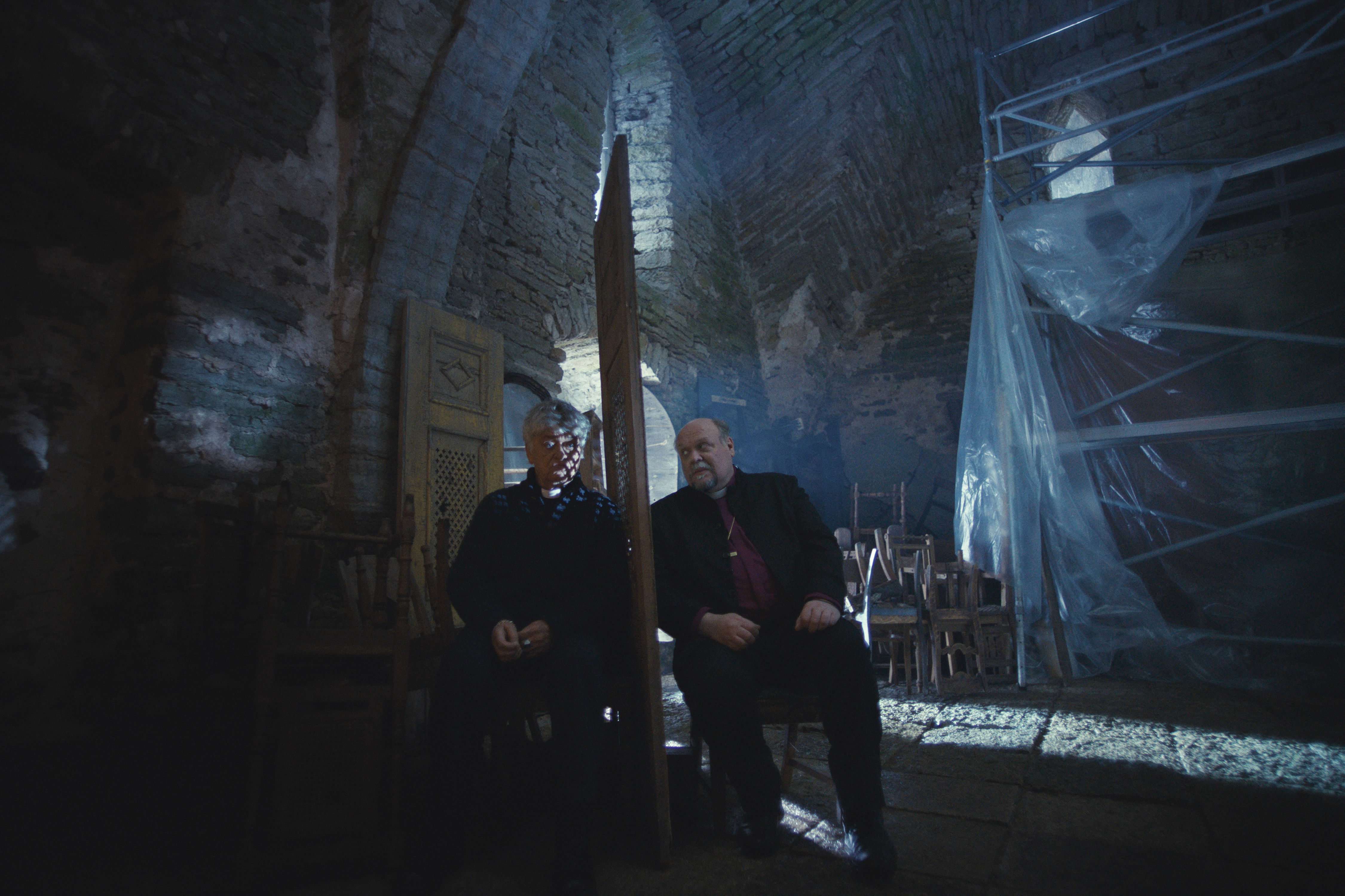 Pirkko Saisio som präst i Orenda, en film hon skrev manus till. ”Jag älskar att ta på mig prästkläderna”, säger hon. Foto: Max Smeds
