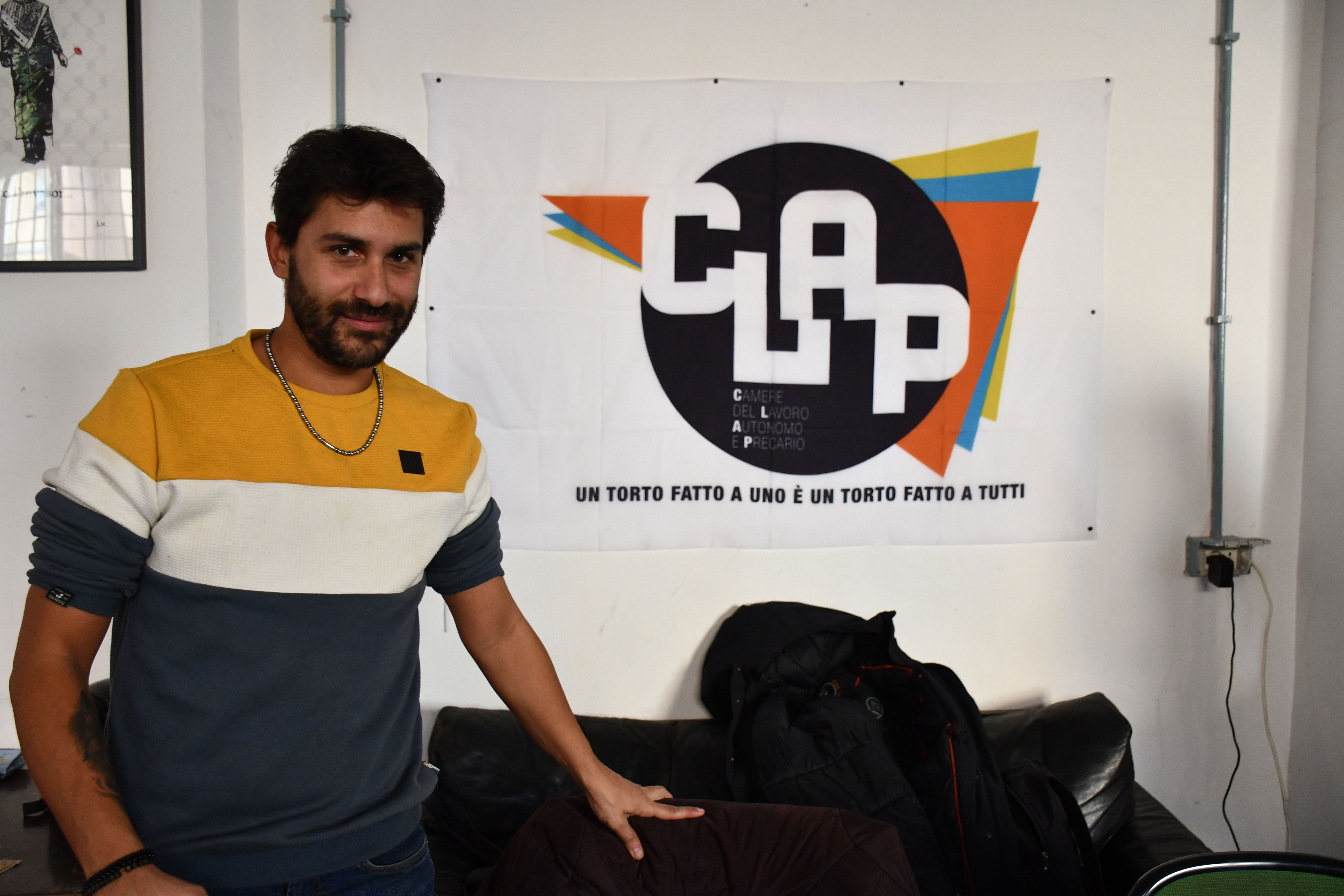 Claps arbetslokal, mötesplats och bar fungerar som en självförvaltad referenspunkt för kultur och organisering för social kamp. Här möter Tiziano Trobia, en av Claps två företrädare som arbetar heltid med att kämpa för bland annat kulturarbetares rättigheter, upp. På väggarna hänger Palestinaflaggor och en stor illustration från det transfeministiska nätverket Non una di meno (Inte en mindre).