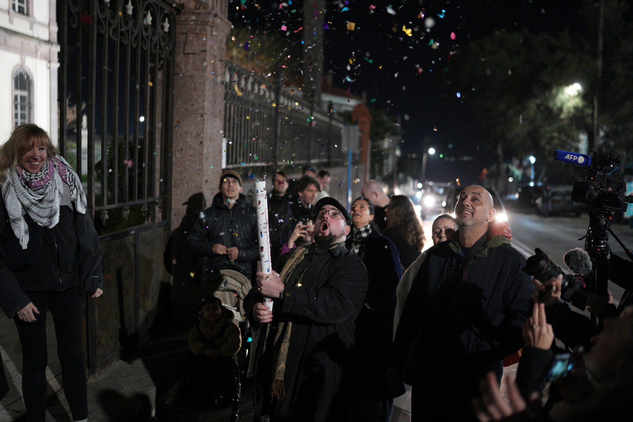 Firande, friade hjälparbetare efter domen i januari. Foto: Panagiotis Balaskas/TT