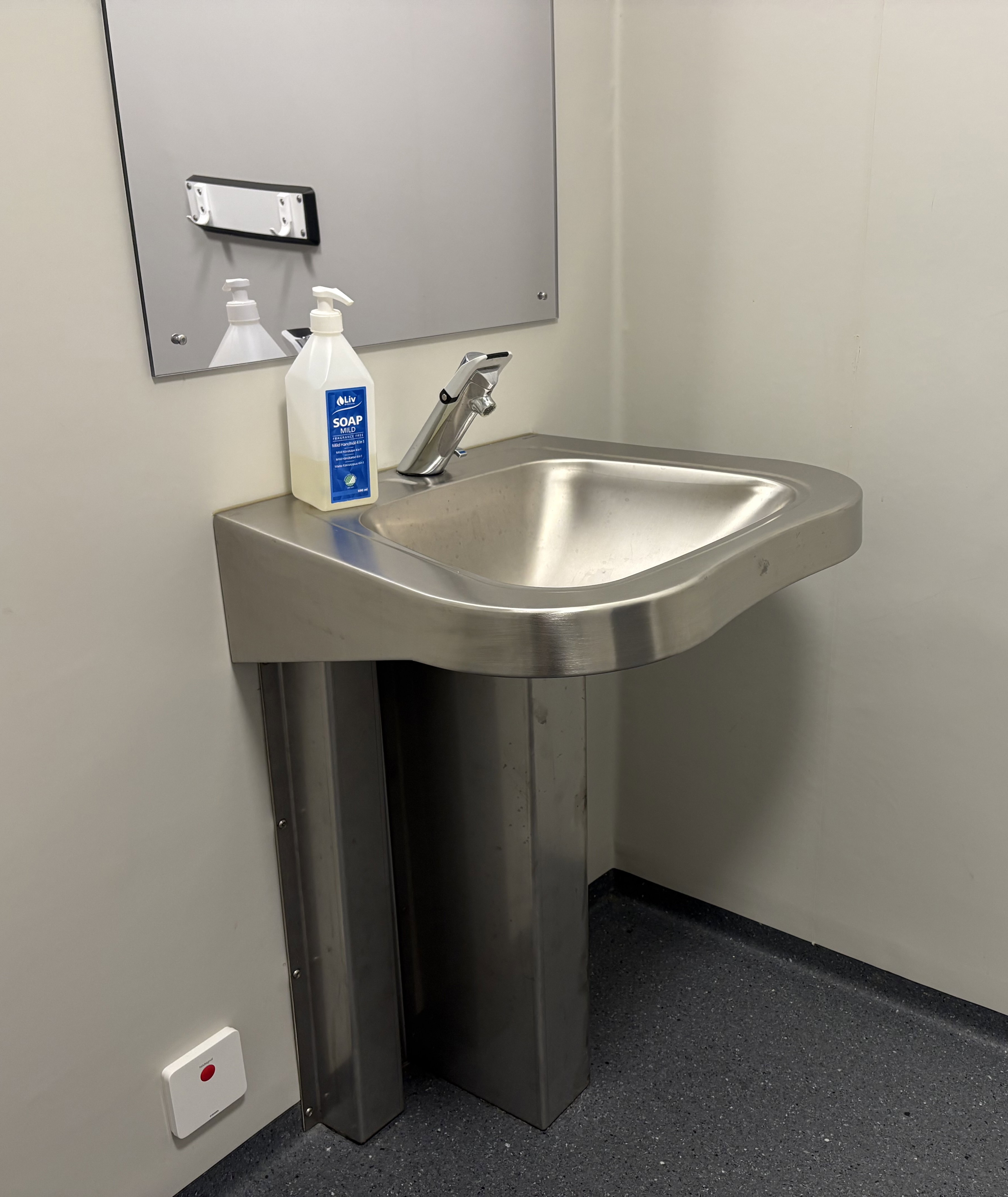 Vår besökstimme är slut och Ali går fram till den lilla högtalaren vid dörren och trycker på en knapp för att kunna kontakta personalen.