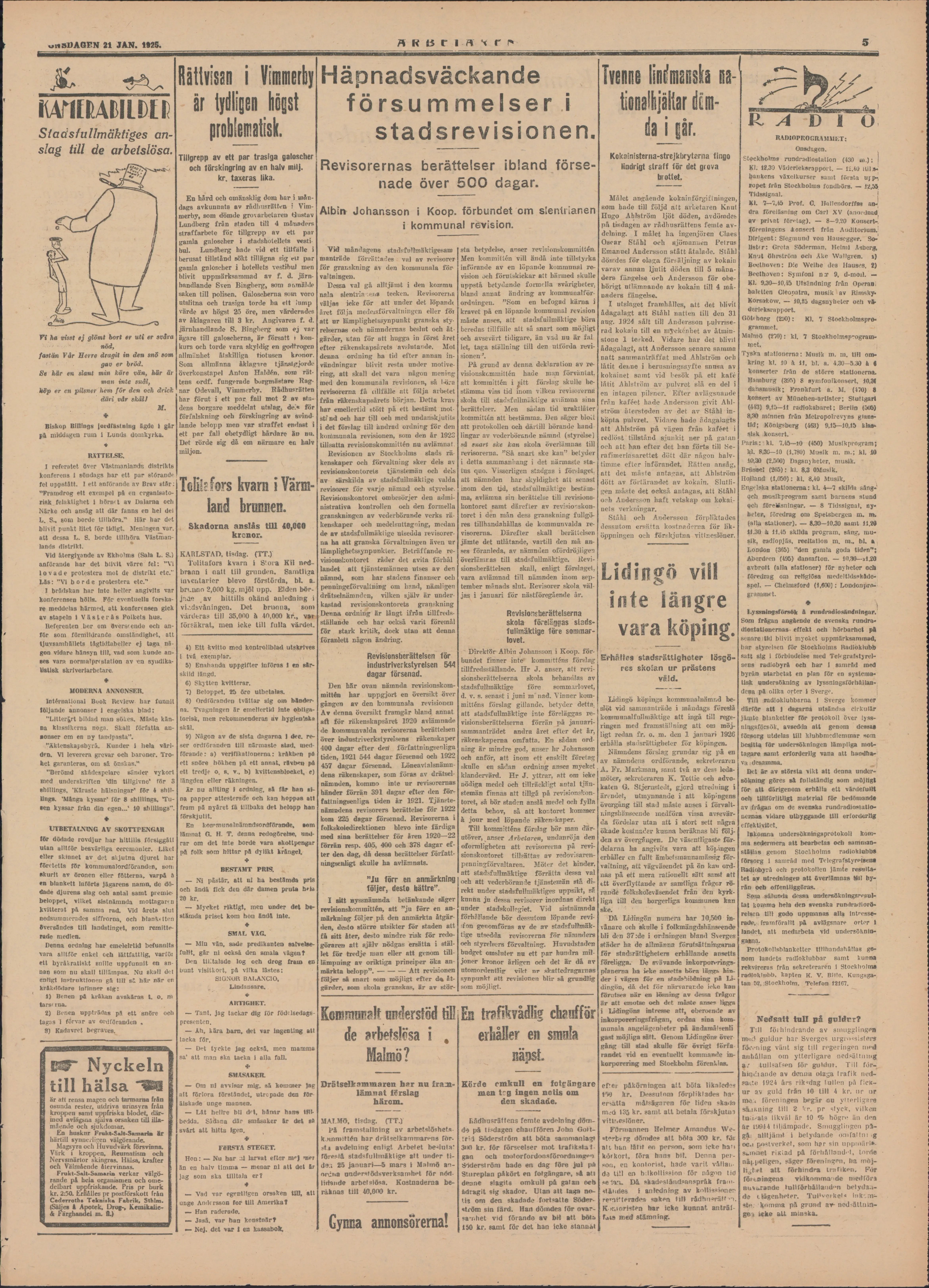 M K 45 r I H •< r I* efter påkörningen att böta likaledes 150 kr. Dessutom förpliktades ba* ersätta måtsigaren för tiden skada med 135 kr, samt att betala förskjutna vitlnestöner. Förmannen Helmer Amandus We sterberg dömdes att böta 300 kr. för alt han täftf en person, som icke bad körkort, föra hans bil. Denna per son, en kontorist, hade varit vållan de till en bilkollission för någon tid selar». Då skadeståndsanspråk fram ständes i anledning av koltissionen remitterades saken til) rådhusrätt vo. Kunomten har icke kurmat anträf fat» med stämning. 5 Rättvisan i Vimmerby är tydligen högst pr Tillgrepp av ett par trasiga galoscher och förskingring av en halv milj. kr. taxeras lika. En härd och omänsklig dom har i mån dags avkunnats av rådhusrätten i Vim merby, som dömde grovarbetaren Gustav Lundberg från staden till 4 månaders straffarbete för tillgrepp av ett par gamla galoscher i stadshotellets vesti bul. Lundberg hade vid ett tillfälle i berusat tillstånd sökt tillägna sig etr par gamla galoscher i hotellets vestibu) men blivit uppmärksammad av f. d. järn handlande Sven Bingberg, som anmälde saken till polisen. Galoscberna som voro utslitna och trasiga torde ba ett lump värde av högst 25 Öre, men värderades av åklagaren till 3 kr. Angivaren f. d. järnhandlande 8. Bingberg som ej var ägare till galoseherna, är försatt i kon kurs och torde vara skyldig en godtrogen allmänhet åtskilliga tiotusen kronor. Som allmänna åklagare tjänstgjorde överkonstapel Anton Haldån, som rät tens ordf. fungerade borgmästare Rag nar Odevall, Vimmerby. Rådhusrätten har förut i ett par fall mot 2 av sta dens borgare meddelat utslag, deis för förfalskning oeh förskingring av svind lande belopp men var straffet endast i ett par fall obetydligt hårdare än du. Det rörde sig då om närmare en kalv miljon. ivAMUlAriLILI Stadsfullmäktiges an slag till de arbetslösa. Mc V-e F» Äa j»sst ej glömt bort er uti er svära nöd, fastän Vår Herre dragit i» den snö som gav er bröd. Se här en slant min käre vän, här är man inte snål, köp er en pilsner hem för den och drick därt vdr skålJ M. * ltiskop Billions joidfäslnlnij ägde l går på middagen rum i Lunds domkyrka, * RÄTTELSE. 1 referatet över Västmanlands distrikts konferens I söndags har ett par störande fel uppstått. I ett anförande av Brav står: ”Framdrog ett exempel på en organisato risk felaktighet i hörnet av Daiarna och Närko och ansåg att där fanns en hel del L. S., som borde tillhöra.” Här har det blivit punkt litet för tidigt. Meningen var. att dessa L. S. borde tillhöra Västman lands distrikt. Vid återgivande av Ekholms (Sala L. S.) anförande har det blivit värre fel: ”Vi lovade protestera mot de distrikt etc." Läs: ”Vi borde protestera etc.” 1 brådskan har Inte helter angivits var konferensen hölls. För eventuella forska re meddelas härmed, att konferensen gick av stapeln 1 Västerås Folkets hus. Referenten ber om överseende och an för som förmildrande omständighet, att tjuvsamhällets tågtidtabeller ej taga nå gon vidare hänsyn till, vad som kunde an ses vara normalprestation av en syndika Ustisk skriveriarbetare. * MODEllNA ANNONSER. Intérnational Book Review har funnit följande annonser i engelska blad: "Lilterjjrt bildad man sökes. Måste kån na klassikerna noga. Skall författa an •onser om en ny tamlpasta". ”Äktenskapsbyrå. Kunder i hela vårl dfn. Vi leverera grevar oeh baroner. Tro het garanteras, om så önskas.” ”Berömd skådespelare sänder vykort med underskriften 'din tillgivne’ för 3 Bhtllings, 'Käraste hälsningar’ för 4 shil lings. 'Många kyssar’ för 8 shillings. Tu sen kyssar från din egen...’ iO shillings”. + ETBETALNING AV SKOTTPENGAR för dödade rovdjur har bittiils försiggått utan alltför besvärliga ceremonier. Liket eller skinnet av det skjutna djuret har företetts för kommunalordföranden, som skurit av öronen eller fötterna, varpä ä «n blankett införts jägarens namn, de dö dade djurens slag och antal samt premie beloppet. vilket sistnämnda mottagaren kvitterat på samma rad. Vid årets slut nedsummerades slfrrorna, och blanketten översändes till landstinget, som remitte rade medlen. Denna ordning har emelelrtid befunnits vara alltför enkel och lättfattlig, varföi ett byråkratiskt snille uppfunnit en an nan som nu skall tillämpas. Nu skall del entigt instruktionen gä titt så här när en krftkdödare infinner sig; 1) Benen pä kråkan avskäras t. o. ni tars< rna. 2) Benen uppträdas pä ett snöre ooh tagas i förvar av ordföranden . 8) Kadavret begraves. R A D I O RADIOPROGR A M MET; Onsdagen, Stoekholms rnndradlostation (430 m.): | Kl. 12,30 Väderleksrapport. — 12,40 Hils bankens växelkurser samt första uj pi ropet frän Stockholms fondbörs. — 12,55 Tidssignal. Kl. 7—7,45 Prof. C. Hallendorffss an dra föreläsning om Carl XV (anordnad av privat företag). — 8—9,20 Konsert-! föreningens ionsert frän Auditorium: Dirigent: Siegmund von Hauscgger. So llstfr: Greta Söderman, Helmi Åsberg, Knut ölirström oeh Äke Wallgren. ») Beelhoven: Die Weihe des Hauses. 2) Beethoven: Symfoni n:r 9, d-moil. — Kl. 9,30—10,45 Utsändning från Operan, baletten Cleopatra, musik av Rimsky. Korsa+.ow. — 10,15 dagsnyheter ocli vä derleksrapport. Gött borg (290): K). 7 Stockholmspro- grammot. Malmö (270): kl. met. Tyska stationerna kring kl. 10 å 11, bl. a. 4,30-5,30 å < konserter frän de större stationerna. Hamburg (395) 8 symfonikonsert, 10,34 dansmusik; Frankfurt a. M. (470) 8 konsert av Mfinchen-artister; Stuttgart (443) 9,15—11 radiokabaret; Berlin (506) 8.30 minnen frän Metropolrevyns glans tid; Königsberg (463) 9,15-10,15 klas sisk konsert. Paris: kl. 7.45—10 (450) Musikprogram; kl. 8,30-10 (1,780) Musik m. m.; kl, 10 10.30 (2,500) Dagsnyheter, musik. Brussel (265): kl. 8,3 OMusik. Ilojland (1,050): kl. 8,40 Musik. 